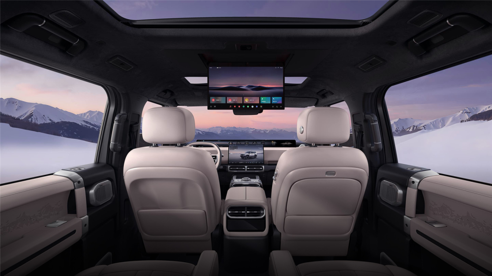 The cabin demonstrates a commitment to premium materials and cutting-edge technology. Approximately 80% of the interior is wrapped in soft-touch leather, accented with Qomolangma-inspired contour trim and metallic rivet detailing. The technological centerpiece comprises a 35.4-inch horizon display paired with a 15.6-inch floating central screen as part of a four-screen interactive system powered by the Kunlun OS, supporting voice commands and dedicated off-road interfaces.